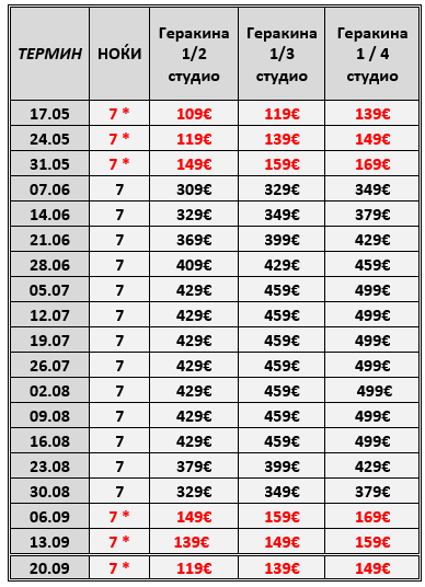ОСТАНАТИТЕ ЦЕНИ ЗА ДАДЕНИТЕ СМЕНИ СЕ ОДНЕСУВААТ ЗА НАЕМ НА СТУДИО ИЛИ АПАРТМАН ЗА 7 НОЌИ