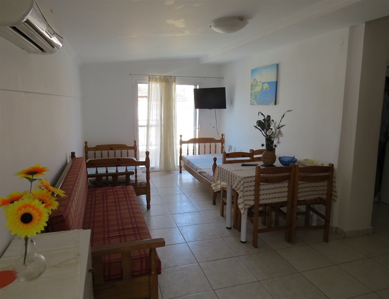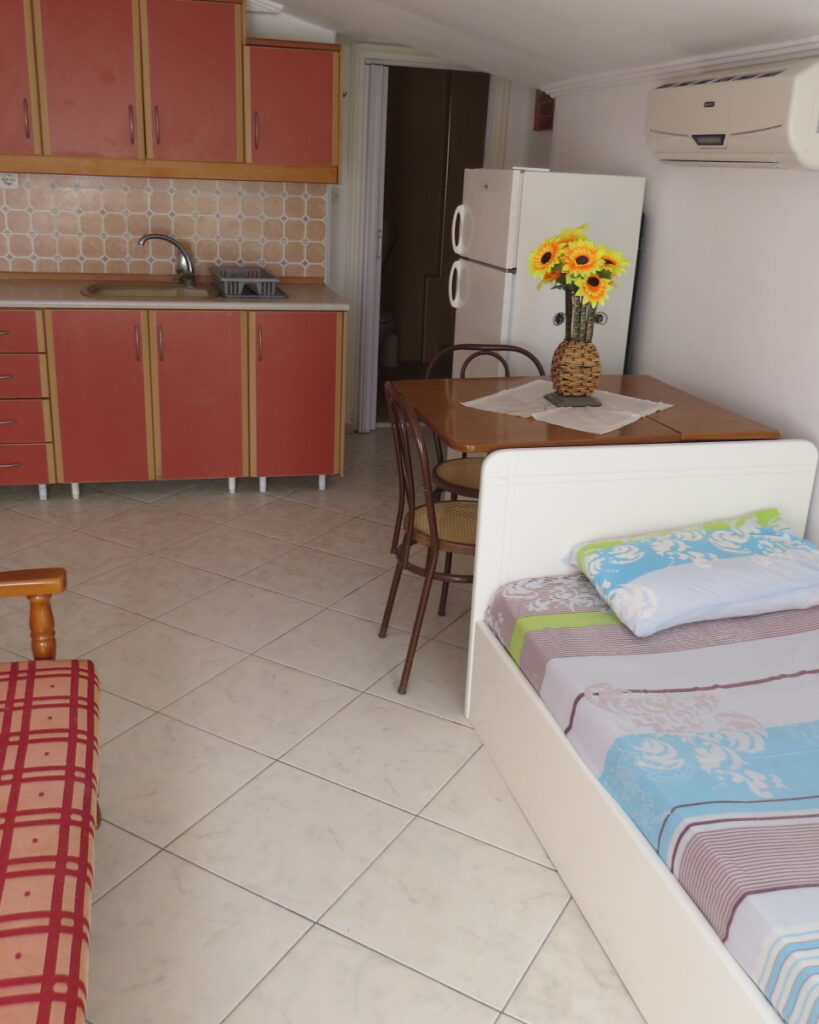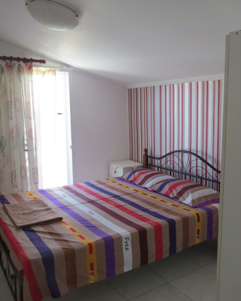 АПП БР.1 – 1/4 Апп на Трет кат. Располага со 2 простории. Спална соба со брачен кревет, купатило, дневна соба со два единечни кревети. Во истата просторија е кујната, опремена со голем фрижидер и шпорет со релна, голема тераса. Климата и ТВ се во дневната просторија.
