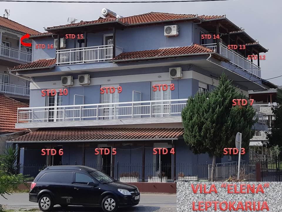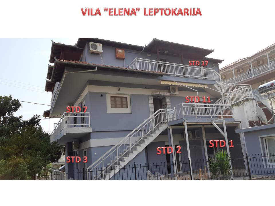 ВИЛАТА “ELENA“СЕ НАОЃА ВО ЛЕПТОКАРИЈА НА САМАТА ПЛАЖА (ПРВ РЕД).РАСПОЛАГАМЕ СО ТРОКРЕВЕТНИ СТУДИЈА НА ПРИЗЕМЈЕ И ПРВИ КАТ,СИТЕ ОПРЕМЕНИ СО КУЈНИ,КУПАТИЛО СО ВЦ,ТВ,КЛИМА УРЕД(СЕ ДОПЛАЌА 8€ ОД ДЕН ДОКОЛКУ СЕ КОРИСТИ),БАЛКОНИ или ДВОР СО ДИРЕКТЕН И СТРАНИЧЕН ПОГЛЕД НА МОРЕ И ЕДНО СТУДИО СО ПОГЛЕД НА ДВОР.СИТЕ СОБИ СЕ СО РЕНОВИРАНИ КУПАТИЛА И КУЈНИ И ДУШЕЦИ.
