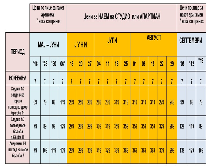 ОСТАНАТИТЕ ЦЕНИ ЗА ДАДЕНИТЕ СМЕНИ СЕ ОДНЕСУВААТ ЗА НАЕМ НА СТУДИО ИЛИ АПАРТМАН ЗА 7 НОЌИ