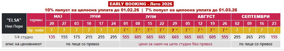 Вила “ELSA” се наоѓа на одлична лoкација во центарот на Неи Пори на по малку од 50m од плажа, позади хотел Олимпик Бич кој е на сама плажа. Вилата е со одличен квалитет на сместување и голем комфорт на студијата, купатилата и балконите. Сите студија се четворокреветни (две дупли легла) и се наоѓаат на приземје, први и втори кат. Секое студио е опремено со: кујна со комплетен прибор за онолку лица према број на легла, фрижидер, тоалет, TV, гардеробер, просторни тераси со тенда за сонце со масичка и столчиња со поглед кон улица (некои студија и со поглед кон море). Wi-Fi интернет – бесплатен, клима со доплата 7€ од ден на лице место. Вилата поседува лифт за гостите. Наспроти вилата има супермаркет. Сите студија се со одличен квалитет и доста просторни. Обезбеден простор за багаж на денот на сместување/заминување на гостите. Гостите со сопствени возила може да се паркираат пред вилата. Ви поасакуваме пријатен престој.