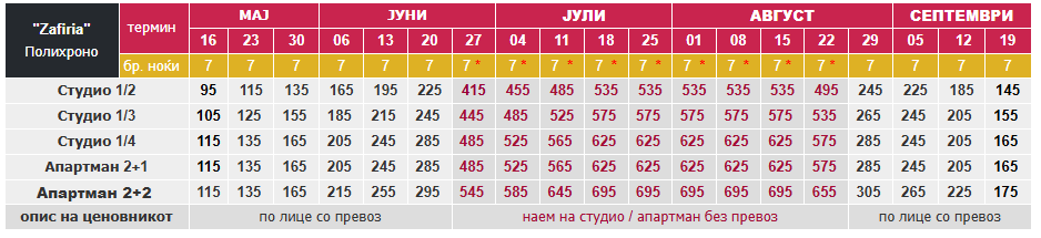 • –  Цените за 7 ноќи/8 дена (со *), се дадени за наем на цел студио / апартман без вклучен превоз;