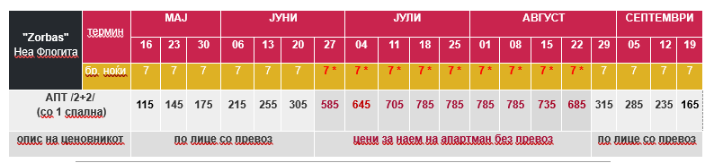 - – Цените за 7 ноќи/8 дена (со *), се дадени за наем на цел апартман без вклучен превоз;