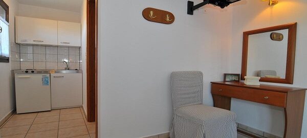 Студиото се наоѓа на високо приземје.Има еден дупол кревет,клима уред, кујната која е комплетно опремена со кујнски инвентар,мал фрижидер,шпорет со две рингли ,аспиратор, Овде има плакар за алишта и клима уред.Од кујната се излегува на тераса со страничен поглед кон море и убав двор полн со зеленило. Студиото располага со стандардно купатило и WC.