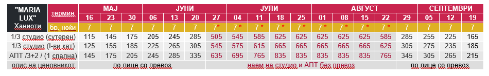 - – Цените за 7 ноќи/8 дена со *, се дадени за наем на цело студио/апартман без вклучен превоз;
