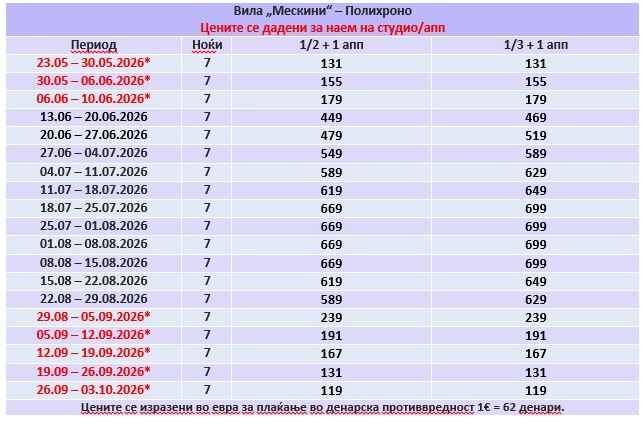 Дадените цени во табелата се по лице со вклучен превоз до крај на јуни, 29.08 и цел септември, а цените во јули и август се за наем на апартман.