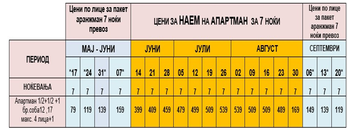 ОЗНАЧЕНИ СО ЗВЕЗДИЧКА * ВО ТАБЕЛАТА СЕ  ПАКЕТ АРАНЖМАНИ И СЕ ДАДЕНИ ПО ЛИЦЕ ЗА 7 НОЌИ СО ВКЛУЧЕН АВТОБУСКИ ПРЕВОЗ