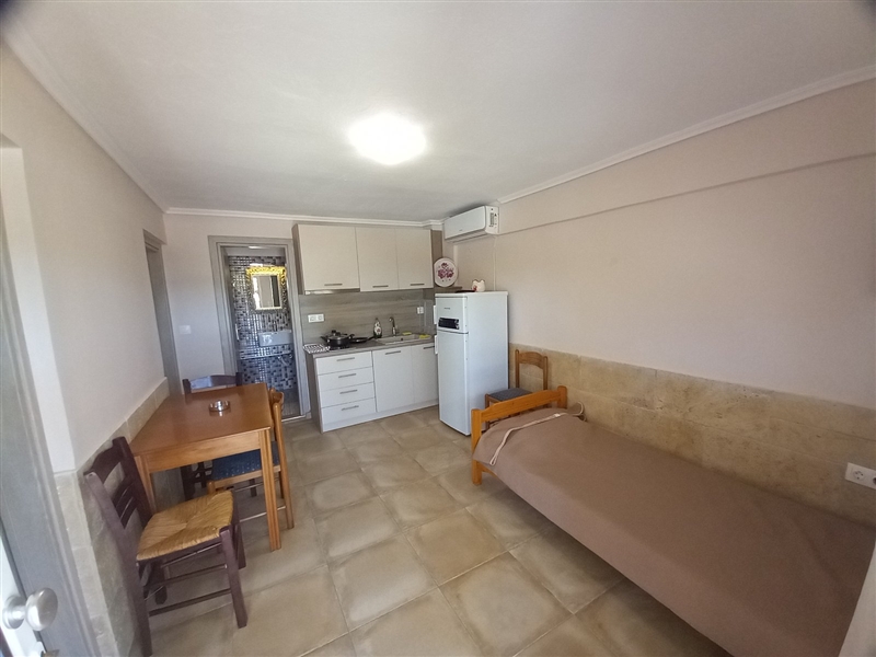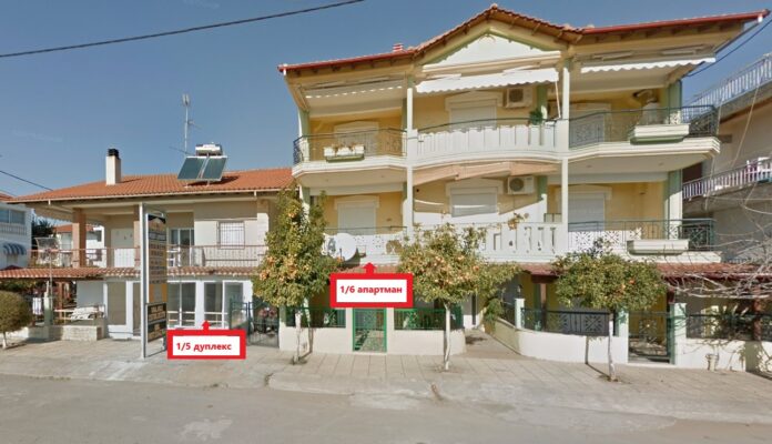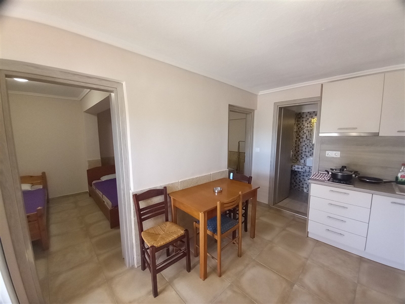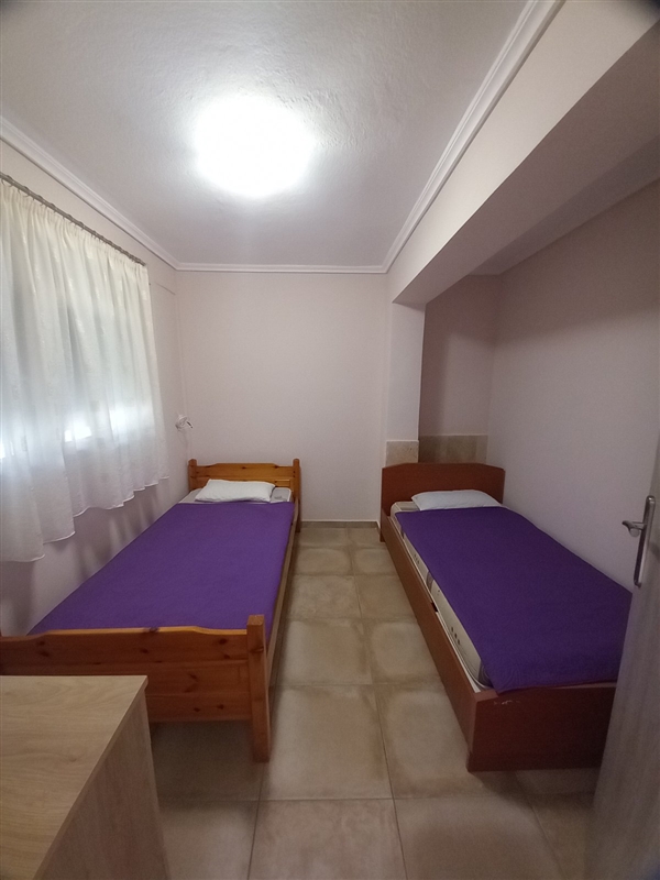 1 /5 Дуплекс на приземје – Располага со 2 Спални соби и дневен престој. Во едната спална има брачен кревет и нема природна светлина (прозор) и втора спална соба со два единечни кревети. Во дневна соба има единечен кревет и во истата просторија е со кујна – опремена со голем фрижидер и решо. Климата и ТВ се во дневната просторија.
