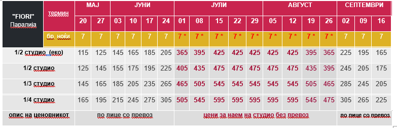- – Цените за 7 ноќи/8 дена со *, се дадени за наем на цело студио без вклучен превоз;