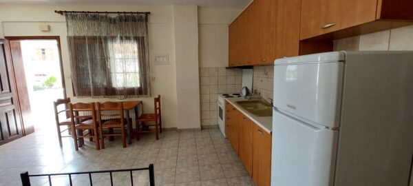 Апартманот располага со кујна ,една спална, купатило со WC и тераса со маса и столици со страничен поглед на море. Во кујната има два поединечни кревети,тв,клима уред и кујната е комплетно опремена со кујнски инвентар ,аспиратор,голем фрижидер,ел.шпорет со рерна. Во спалната соба има еден дупол кревет со натказни.Од кујната се излегува на тераса со маса и столици со страничен поглед на море. Во ходникот има плакар за алишта. Апартманот е опрмен на сите прозори со комарници.