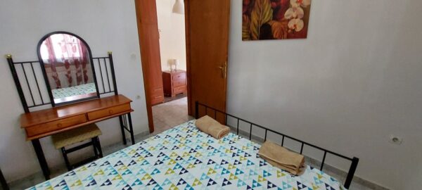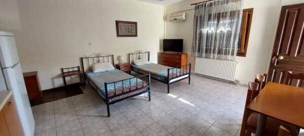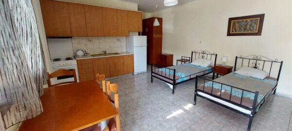 Апартманот располага со кујна ,една спална, купатило со WC и тераса со маса и столици. Во кујната има два поединечни кревети,тв,клима уред и кујната е комплетно опремена со кујнски инвентар ,аспиратор,голем фрижидер,ел.шпорет со рерна. Во спалната соба има еден дупол кревет со натказни.Од спалната и од кујната се излегува на тераса со маса и столици.Во ходникот има плакар за алишта.Апартманот е опрмен на сите прозори со комарници.