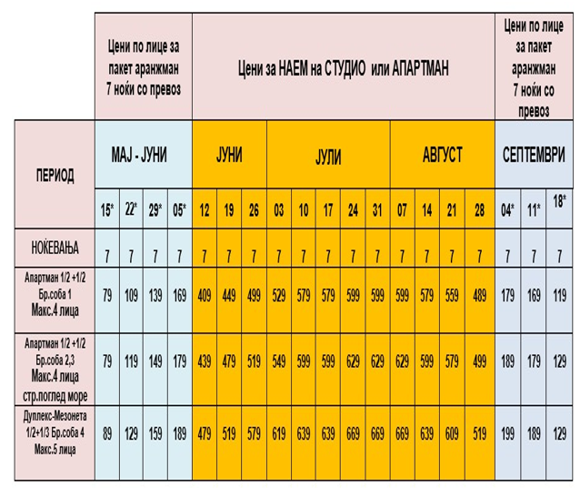 ОЗНАЧЕНИ СО ЗВЕЗДИЧКА * ВО ТАБЕЛАТА СЕ ПАКЕТ АРАНЖМАНИ И СЕ ДАДЕНИ ПО ЛИЦЕ ЗА 7 НОЌИ СО ВКЛУЧЕН АВТОБУСКИ ПРЕВОЗ